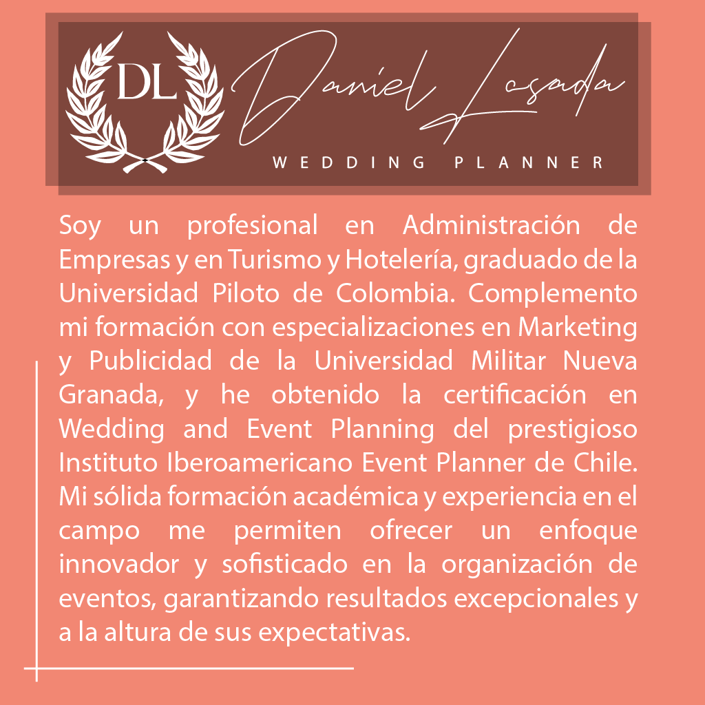 Daniellosadawp es su socio ideal para convertir sueños en celebraciones excepcionales. Nos especializamos en la organización de eventos y la creación de bodas que combinan emoción y modernidad, con un enfoque elegante y sofisticado.